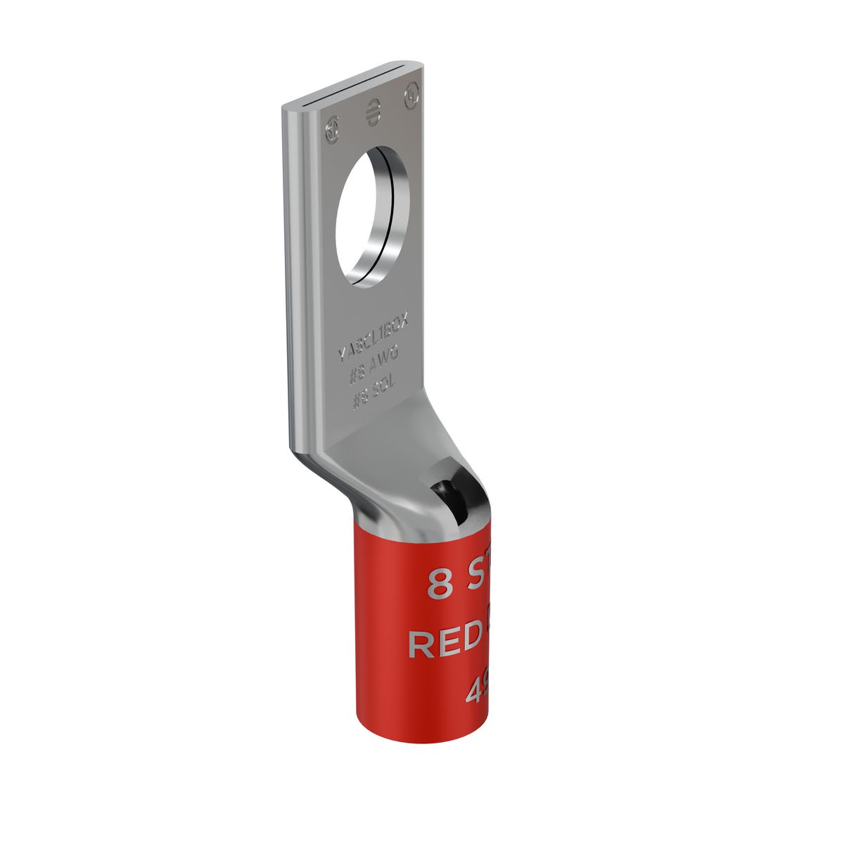 BURNDY® HYLUG™ Compression Lug, 1-Hole, Series: YA-L, Flexible/Solid/Stranded Copper Conductor, 8 AWG Conductor, Die Code: 49, 600 VAC to 35 kV, 1/4 in Stud, Standard/Straight Tongue, 0.44 in W x 0.08 in THK Tongue, 1.26 in Overall Length, Chamfered/Short/Standard Barrel, 0.44 in L Barrel, 1/2 in L Wire Strip, Tin Plated, 90 deg C, Copper, Red