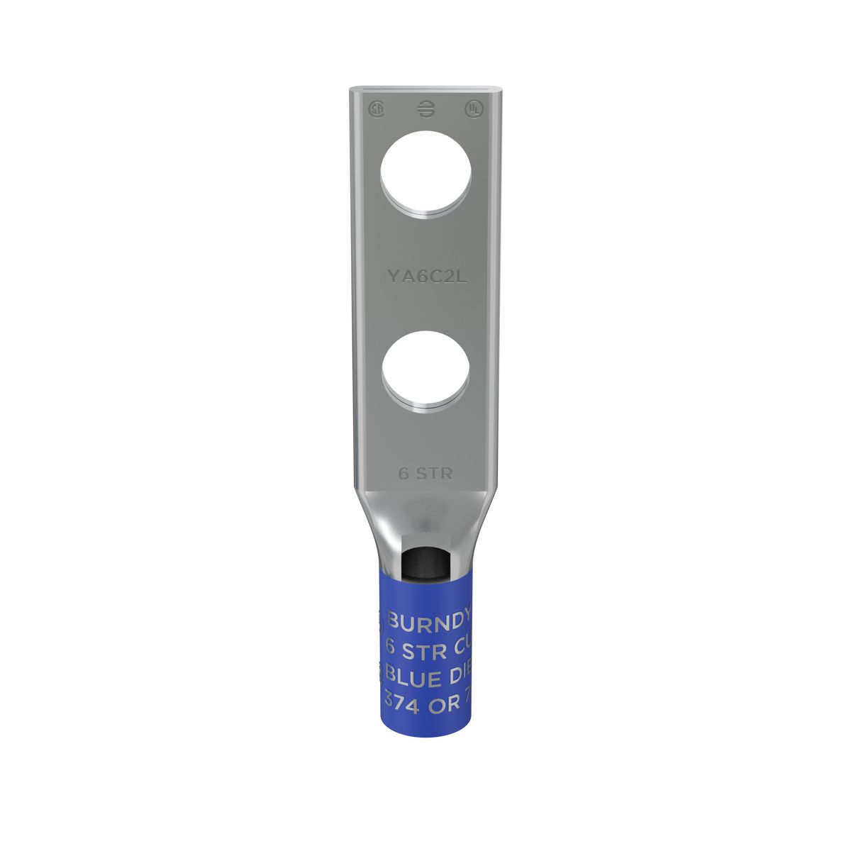 - BURNDY® HYLUG™ Compression Connector Lug, 2-Hole, Series: YA-C-2L, Stranded Copper Conductor, 6 AWG Conductor, Die Code: 7/374, 600 VAC to 35 kV, 1/4 in Stud, Straight Tongue, 0.45 in W x 0.08 in THK Tongue, 2.01 in Overall Length, Chamfered/Short/Skived/Standard Barrel, 0.29 in OD x 0.54 in L Barrel, 5/8 in L Wire Strip, 5/8 in Stud Hole Spacing, Electro-Tin Plated, 90 deg C, Copper, Blue