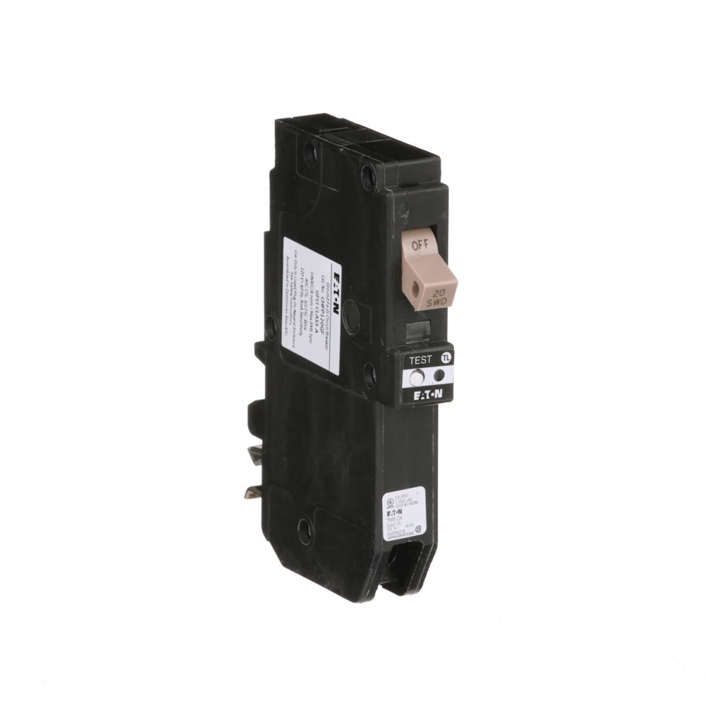 - EATON GFCI Circuit Breaker, Type CH Ground Fault Self-Test, 120/240 VAC, 20 A, 10 kA Interrupt, 1 Pole, Plug-On Neutral Connection, Plug-On Mounting, 4-1/2 in L x 3/4 in W x 3-1/4 in H Dimensions