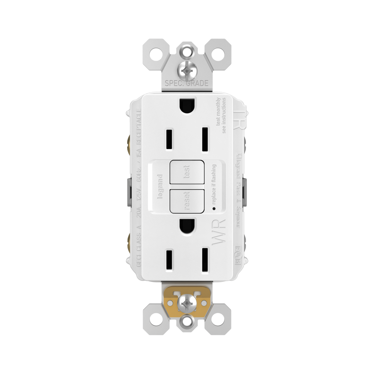 - Pass & Seymour® Radiant® GFCI Receptacle, Duplex Self-Test Tamper/Weather-Resistant, Series: 1597TRW, 125 VAC, 15 A, 60 Hz Frequency, 2 Pole, 3 Wires, NEMA 5-15R NEMA Rating, Residential/Specification Grade, -35 to 66 deg C, Back/Side Wire/Screw Terminal, Nylon/Thermoplastic, White, 1.03 in L x 1.73 in W x 4.2 in H Dimensions