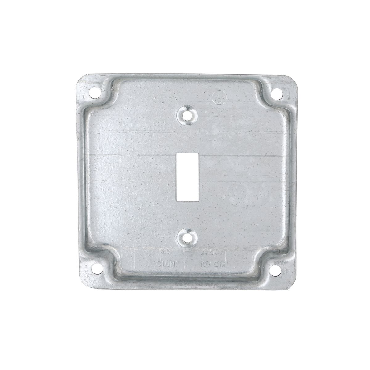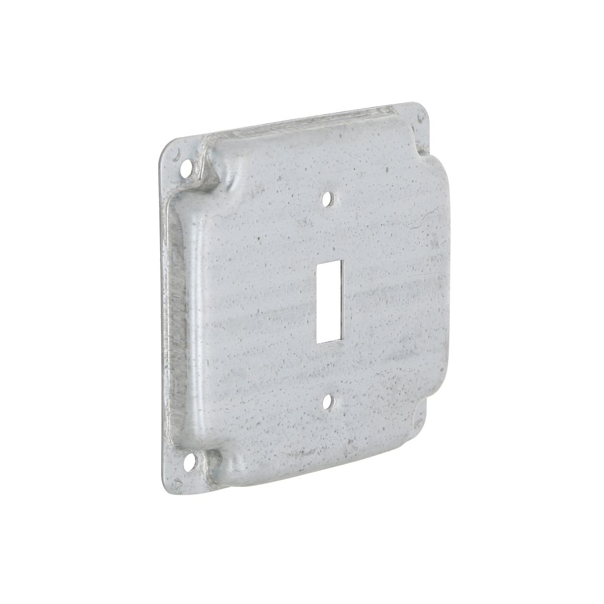 - RACO®, 800C, Exposed Work Cover, 1 Outlets, 1 Gangs, 4-1/8 in Length, 4-1/8 in Width, 1/2 in Depth, 0.563 in Thickness, Squared Shape, Toggle Switch Cover, Surface Mounting, 6.5 cu-in Capacity, Steel, Pre-Galvanized/Unpainted, Silver