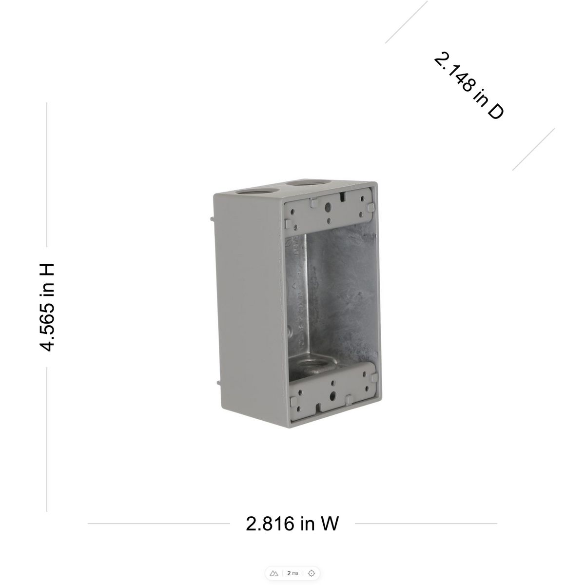 - BELL® Weatherproof Box, 5 Outlets, 1 Gang, 1/2 in Hub, Threaded Hub, NEMA 3R, Surface Mount, 18.3 cu-in, Die Cast Aluminum, Powder Coated, Gray, 2-3/4 in W x 2 in D x 4-1/2 in H