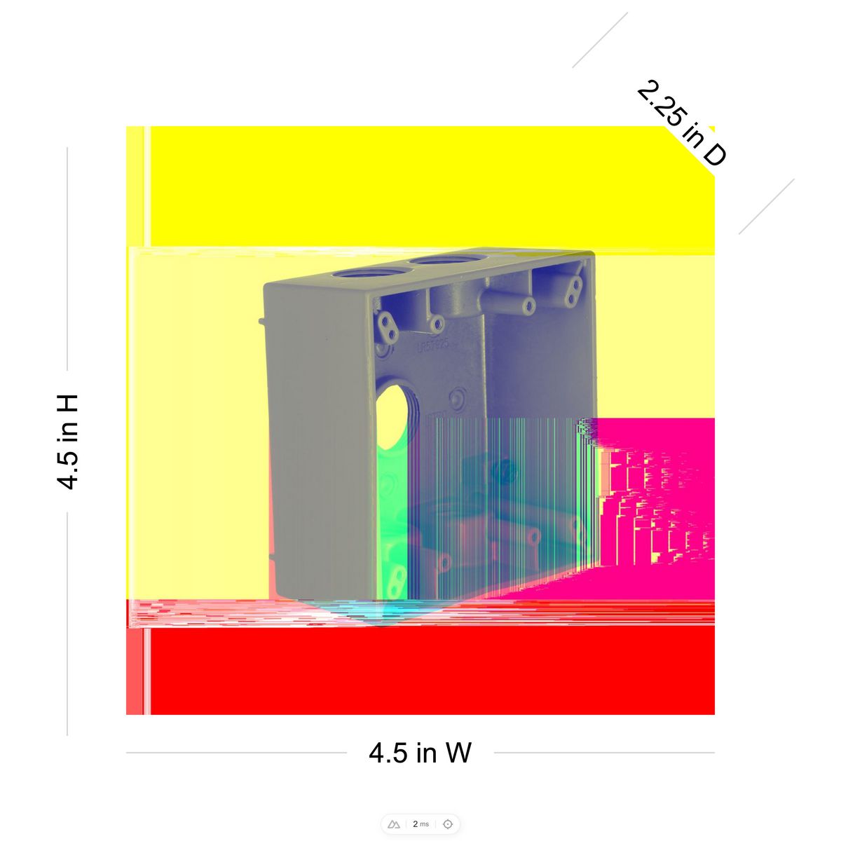 - Brand: Raco HubbellApplication: ElectricalColor: GrayConstruction: MetallicCountry of Origin: INCubic Capacity: 31.0 cu.inDepth: 2.25 inKnockouts: FalseMaterial: AluminumNumber Of Outlet: 5Size: 4.5 H x 4.5 W x 2.125 D INSpecial Features: Weatherproof NEMA 3R rated, 2 INes deep with lugs, five threaded outlets, two closure plugs included, reinforced outlets, powder coat finish, ground screw installed, multi-lingual instructions includedStandard: UL Listed;CSA CertifiedSub Brand: BELLType: 2-GangWidth: 4.5 in