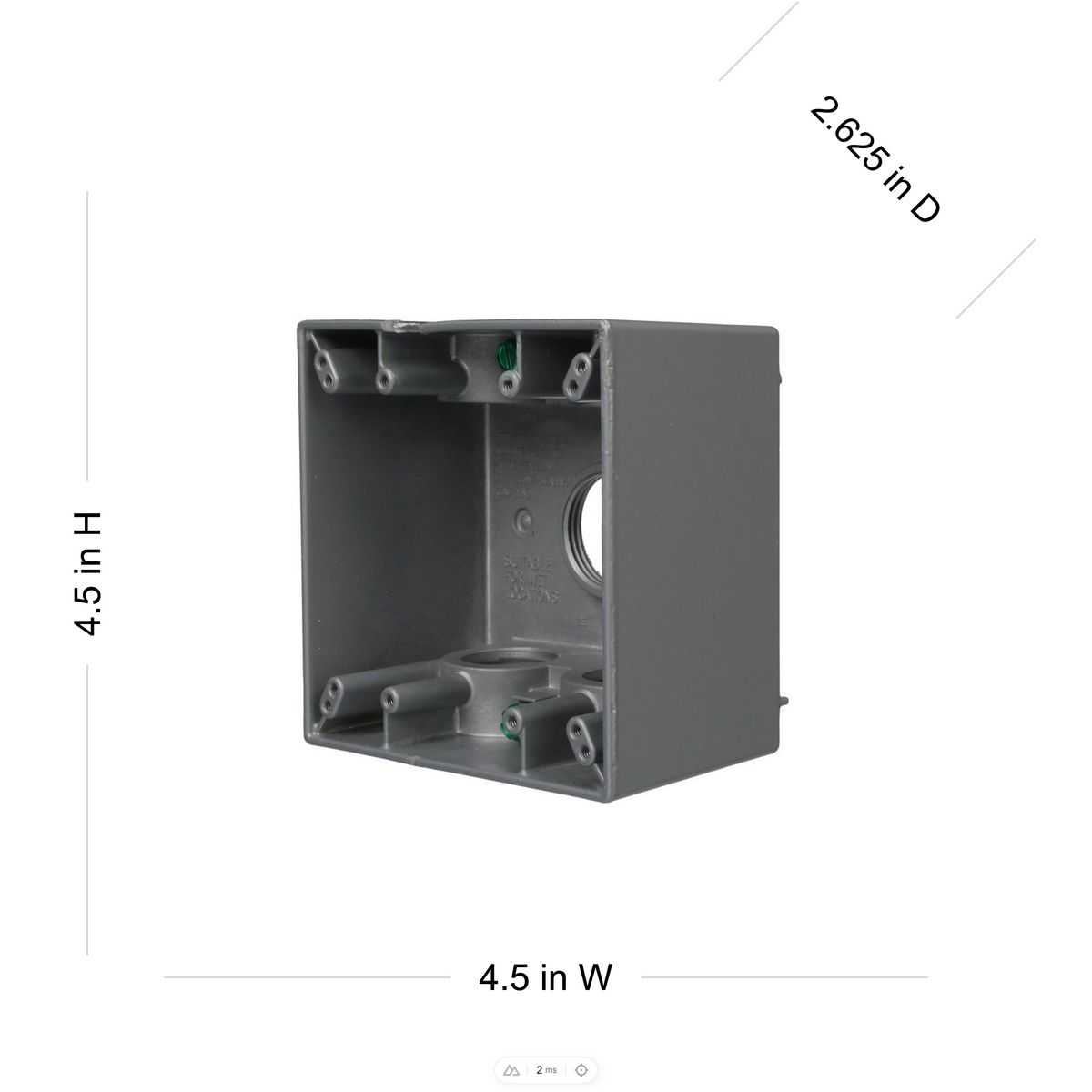 - BELL®, 5389-0, Weatherproof Outlet Box, Deep, 5 Outlets, 2 Gangs, 1 in Knockout, 1 in Hub, Threaded Hub, NEMA 3R Enclosure, Lug Mounting, 36 cu-in Capacity, Die Cast Aluminum, Powder Coated, Gray, 4.5 in H x 4.5 in W x 2.656 in D Dimensions