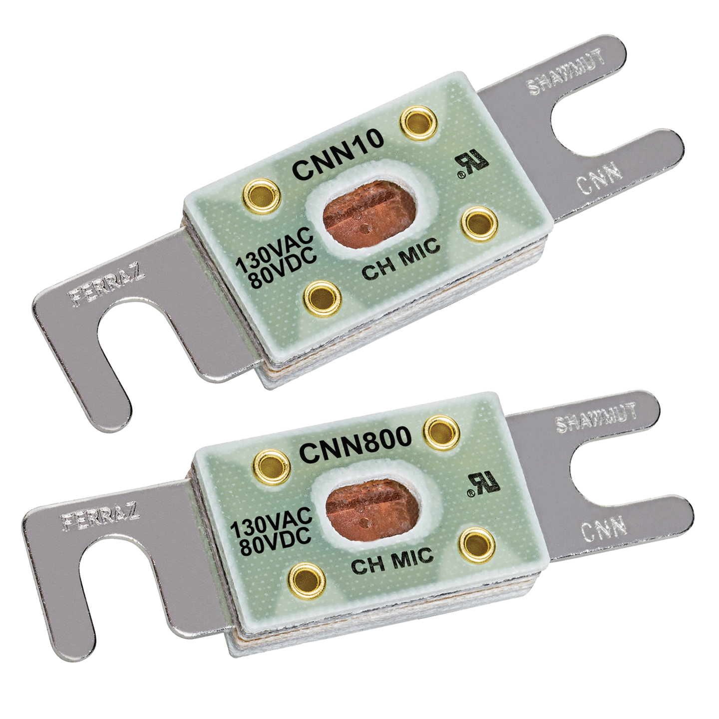 - Mersen Special Purpose Fuse, Very Fast Acting, Series: CNN, Non-Indicating, Non-Rejection, 400 A, 130 VAC/80 VDC, 2.5 kA Interrupt, Blade Terminal, Bolted-On Mounting, Single Element, 3-3/16 in Length, 3/4 in Width, Fiberglass